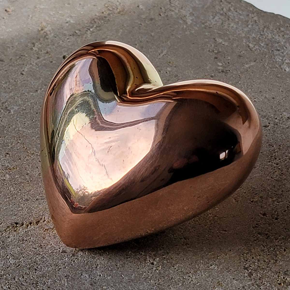 The copper heart has a golden aluminium bronze "repair", whilst the darkly patinated bronze heart has a stainless steel