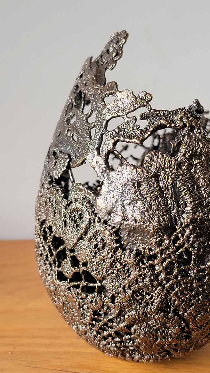 This unique bronze vessel was modelled from small scraps of handmade vintage lace.