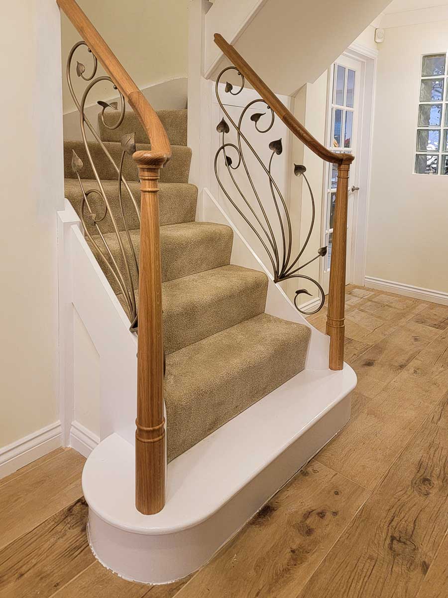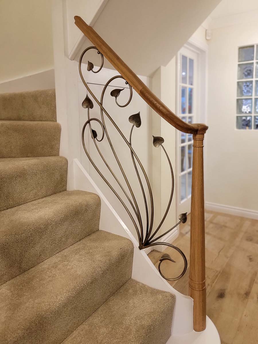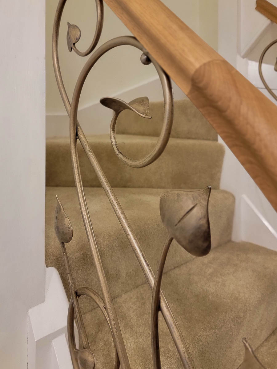 This pair of naturalistic stair railings was influenced by the Arts and Crafts movement. They were carefully designed to have an elegant and uncluttered appearance, whilst still meeting building regulations and the "100mm gap" rule.