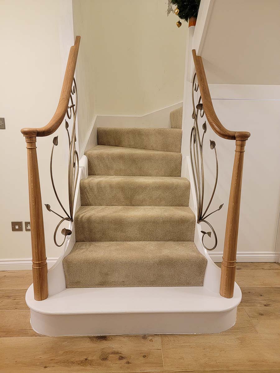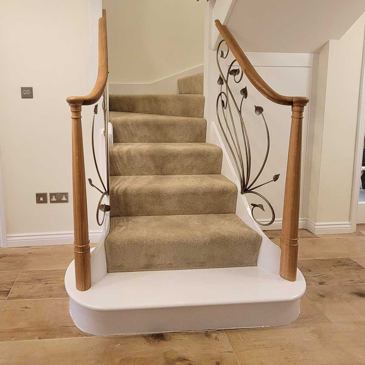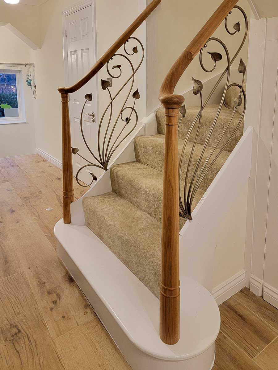This pair of naturalistic stair railings was influenced by the Arts and Crafts movement. They were carefully designed to have an elegant and uncluttered appearance, whilst still meeting building regulations and the "100mm gap" rule.