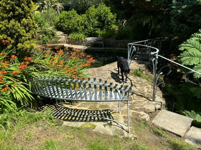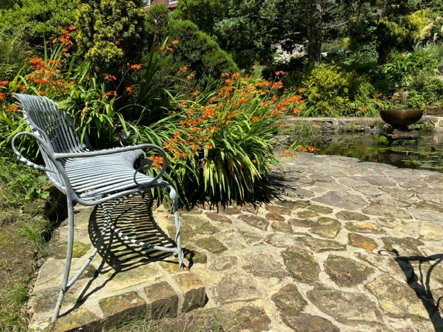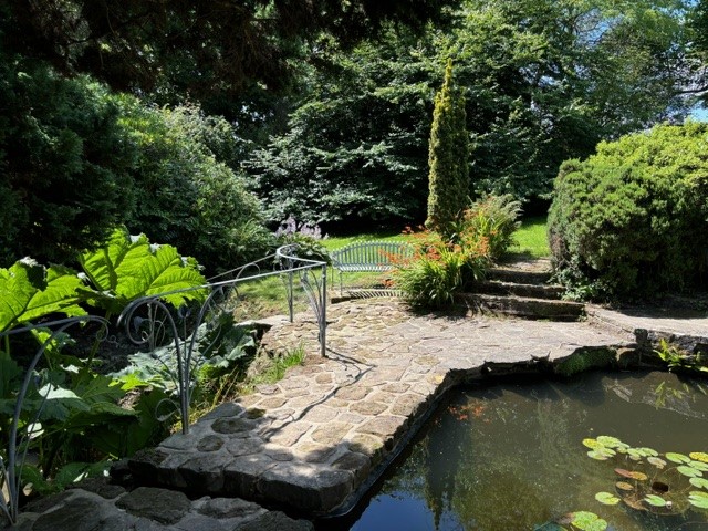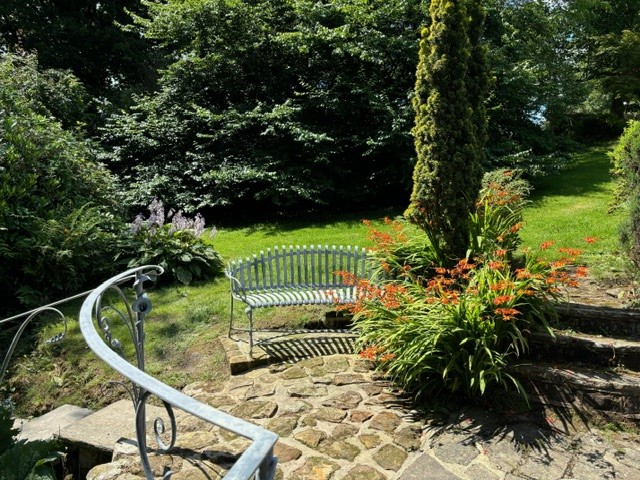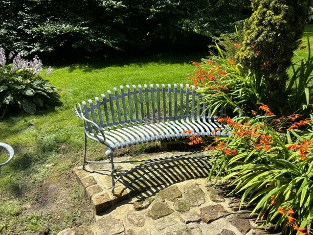The bench's discreet leaf detailing and curved profile complement the design of the