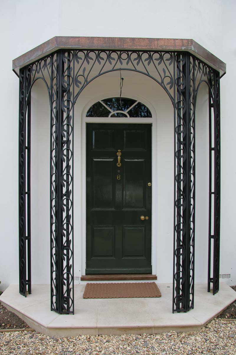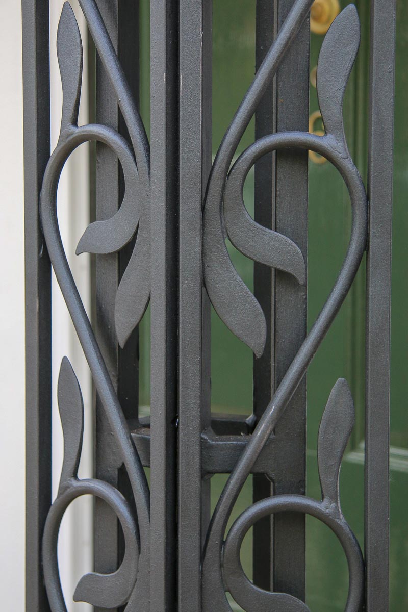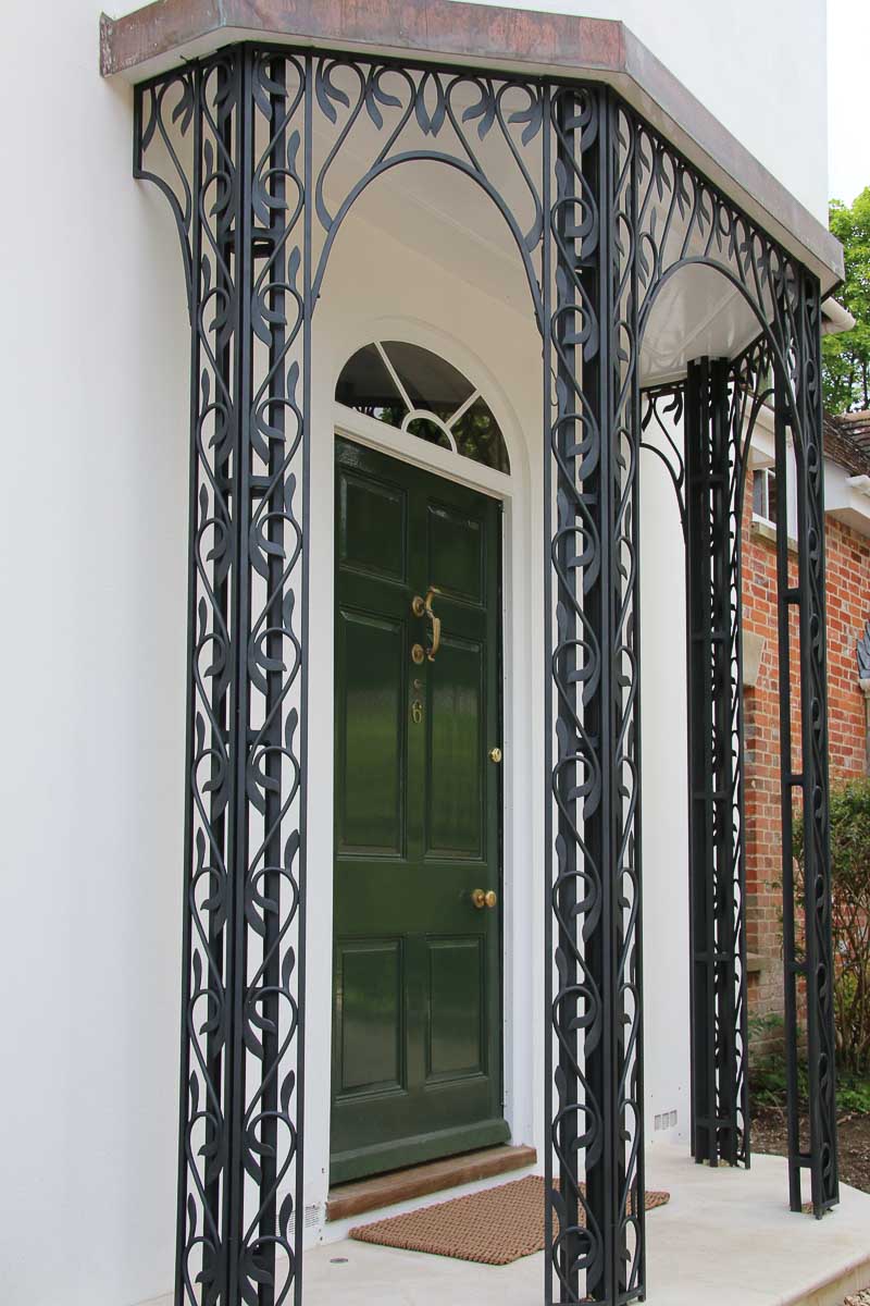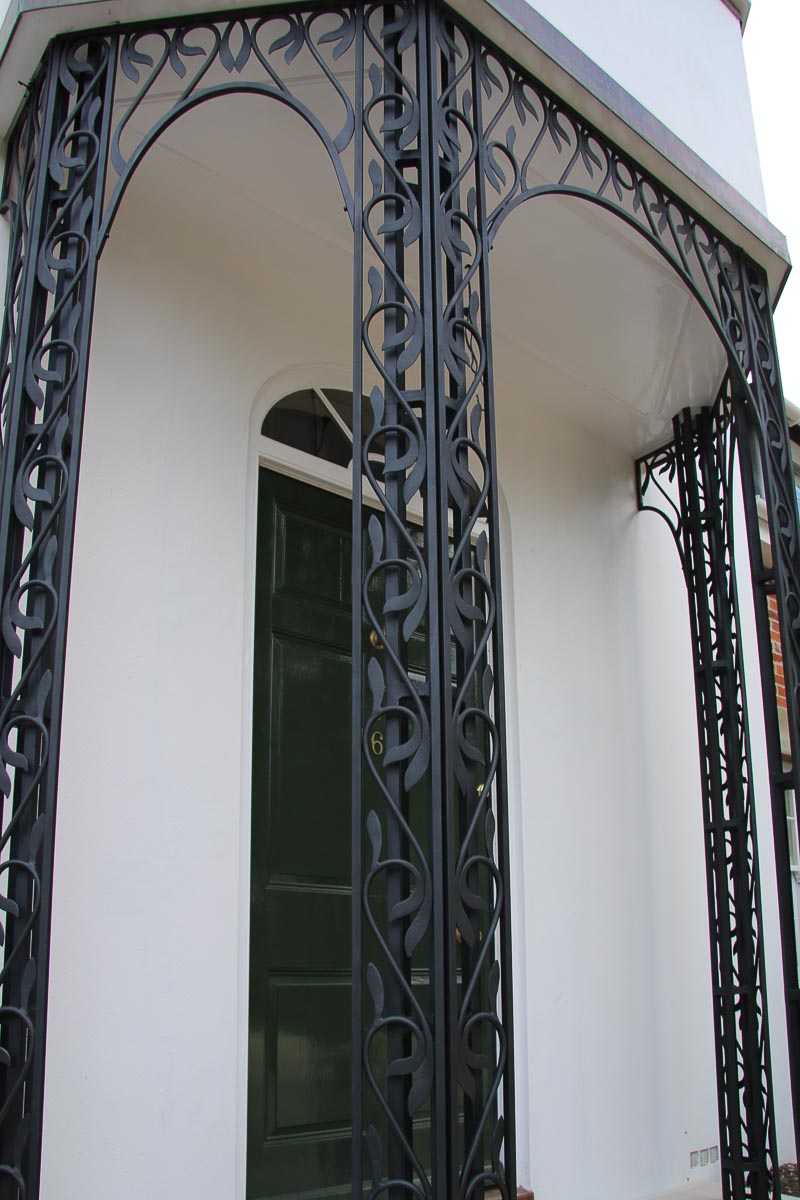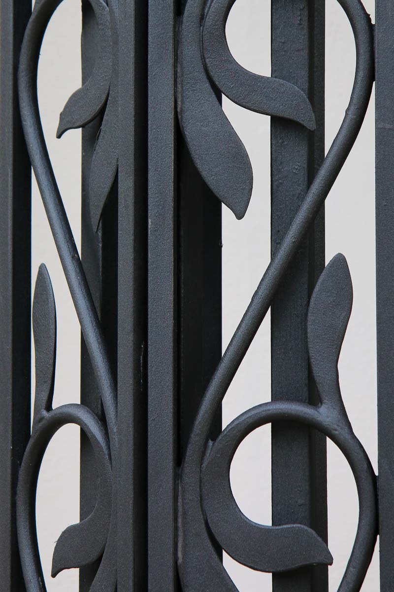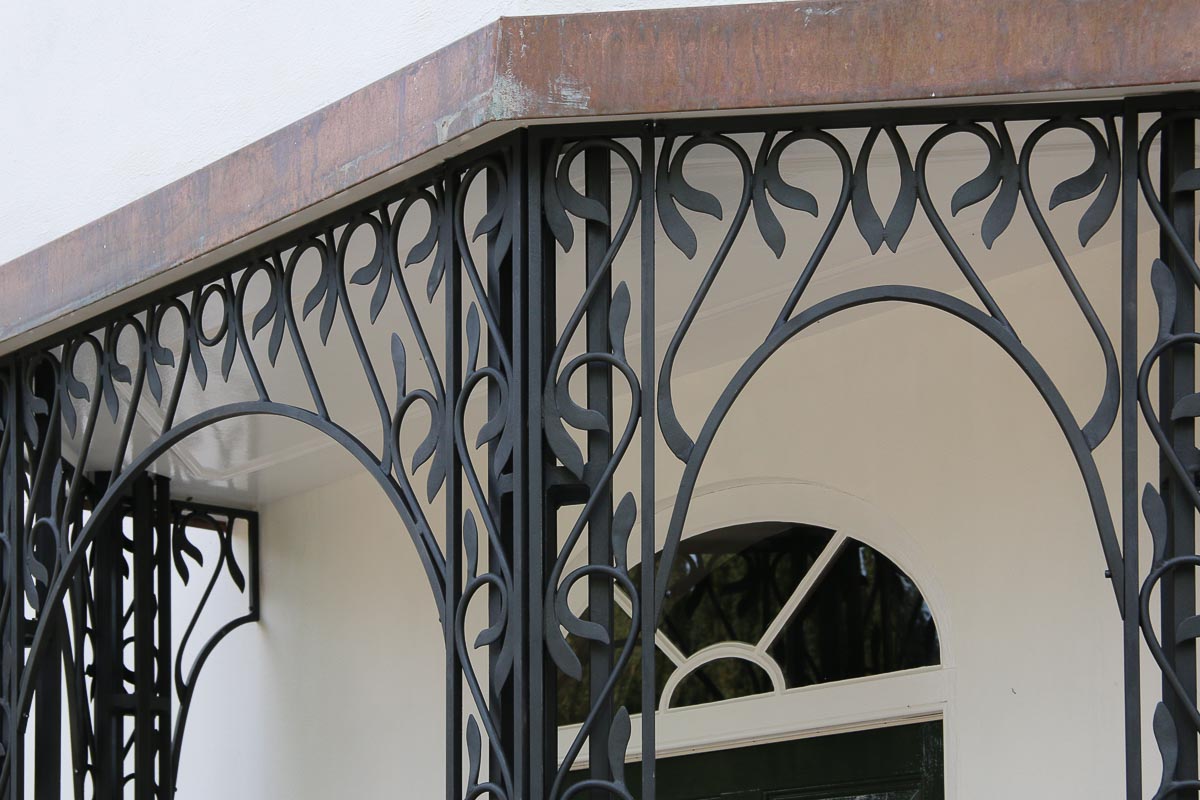 This oriel window is supported by an array of structural box section columns that are disguised by a decorative wrought iron screen. The design uses a series of hand forged motifs that repeat across the screen. Unlike a laser cut silhouette, these have a 3D quality; each is unique and individual. The screen was galvanised for decades of rust protection and finished with a textured micaceous iron oxide paint. |