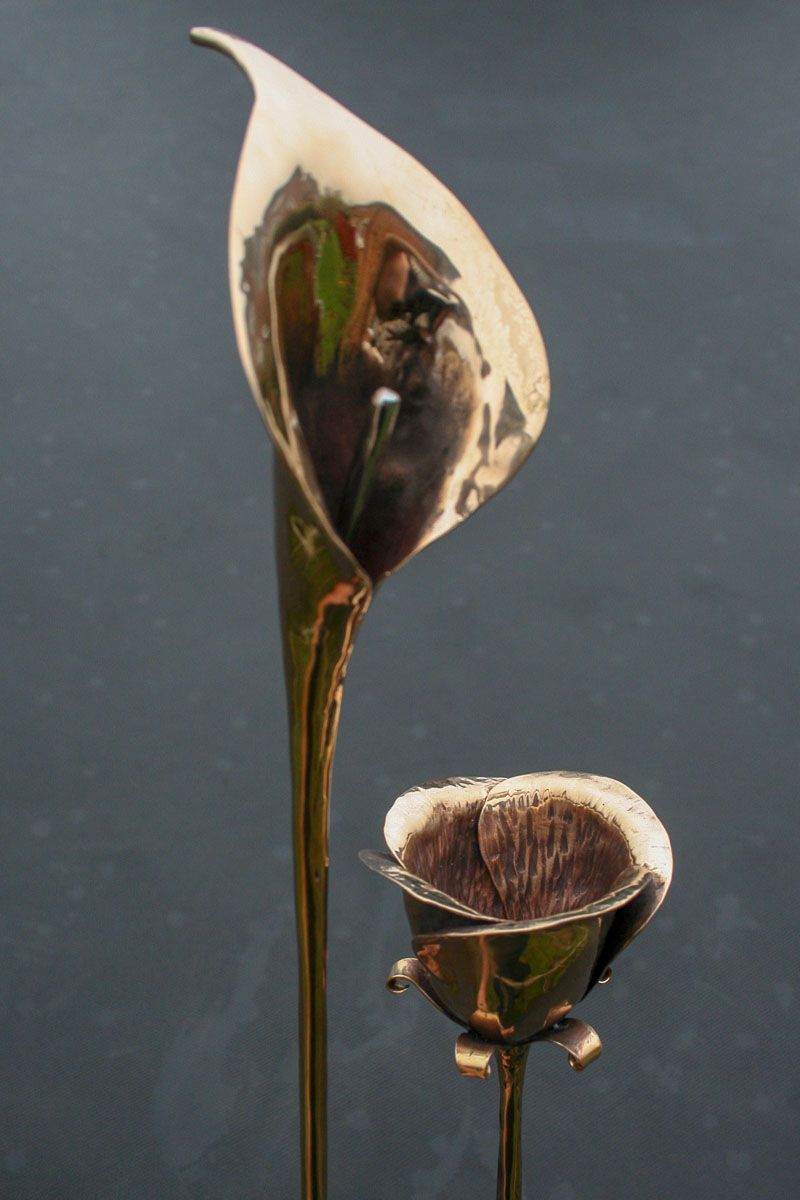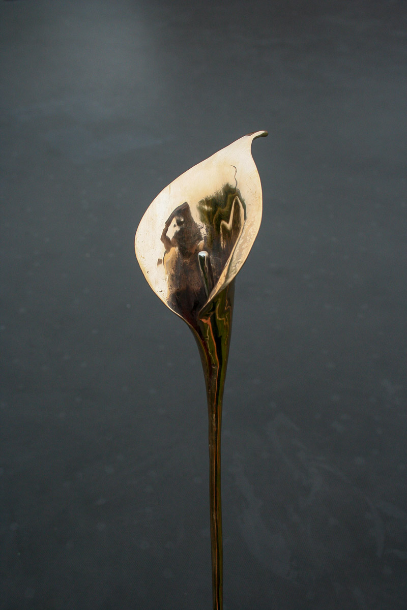 This polished metal calla lily was commissioned for a Valentine's Day present. The petal was forged from bronze whilst the stamen was made from stainless steel. A long stemmed bronze rose was also commissioned at the same time.