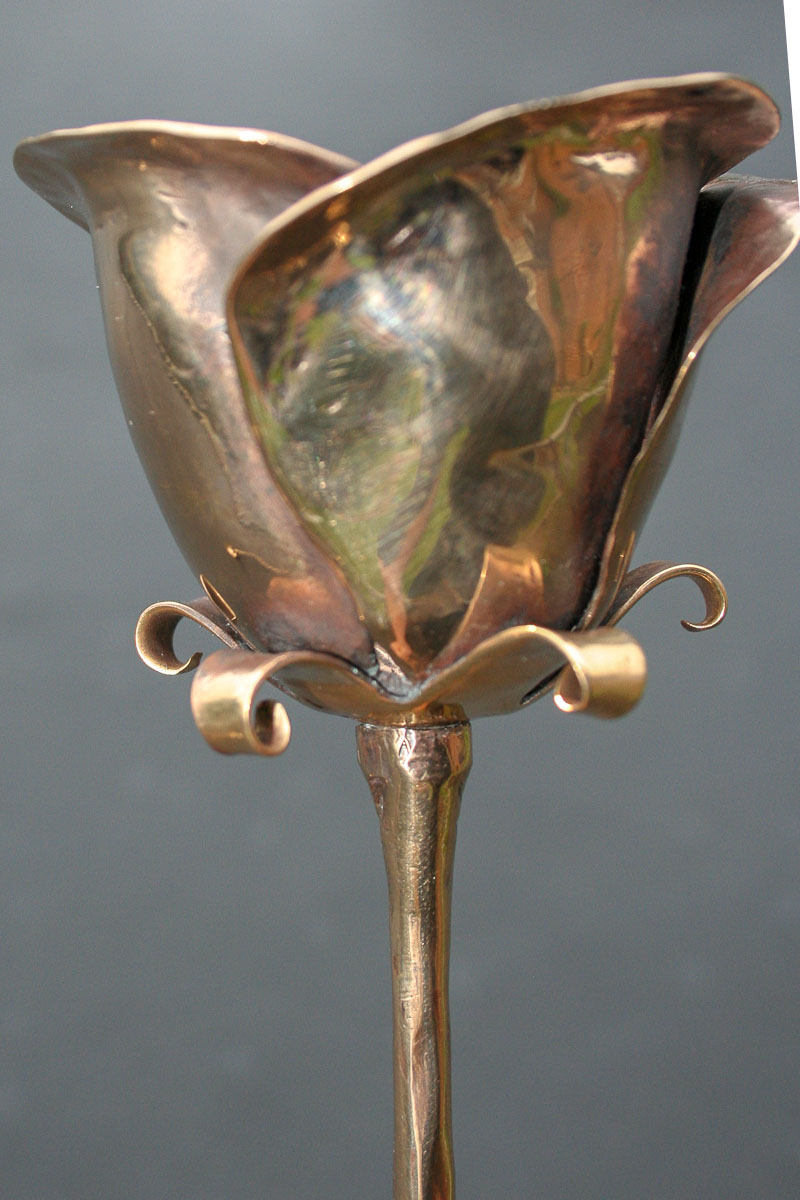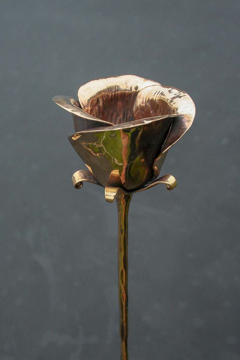This long stemmed metal rose was commissioned for a Valentine's Day present. The petals were forged from silicon bronze then lightly polished without smoothing out the forged texture. A bronze calla lily was also commissioned at the same time.