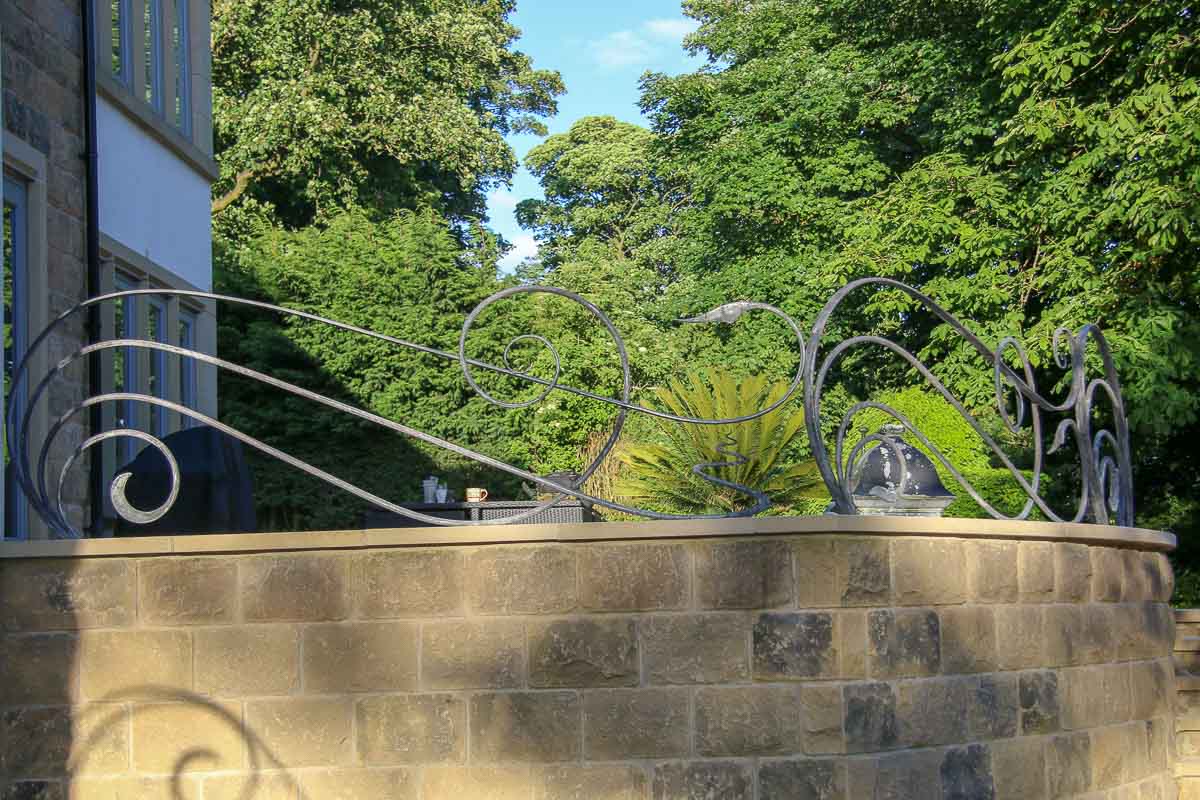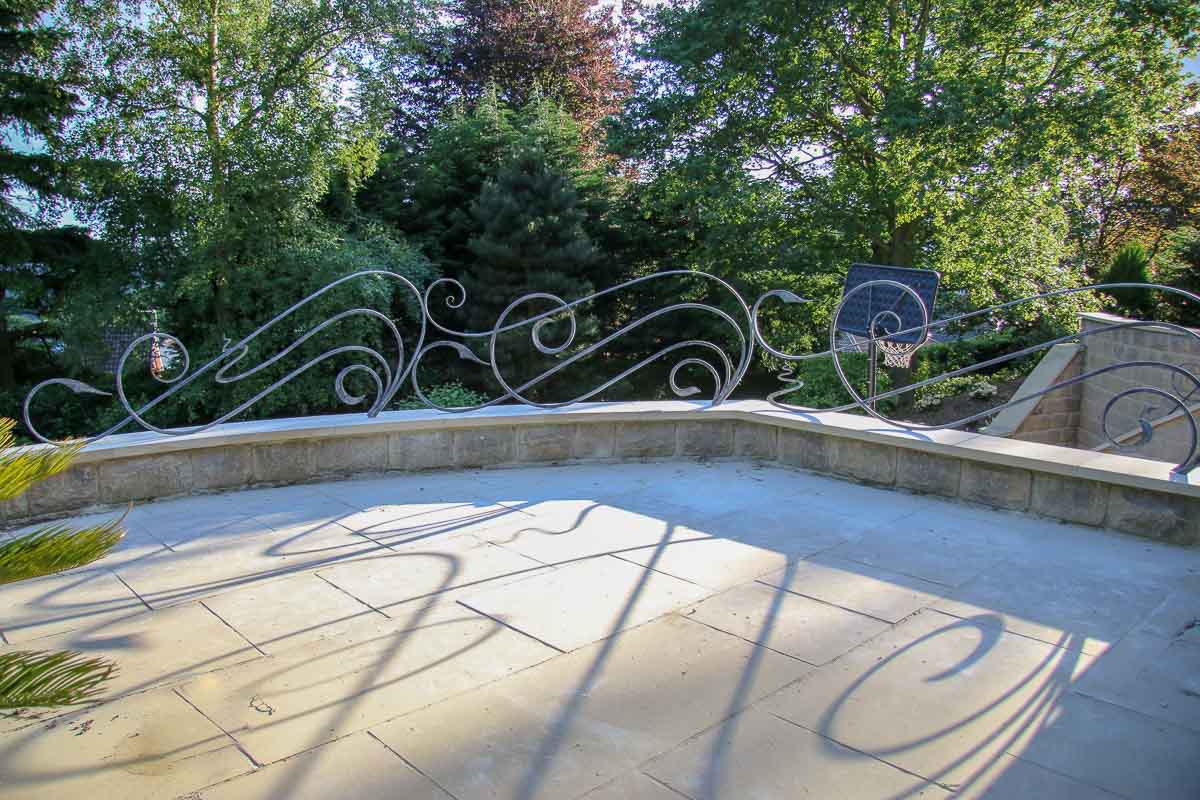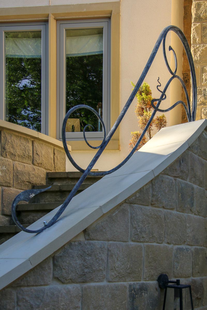 No straight lines were used to create these sweeping and flowing metal railings for a stone terrace. Not only is the design of the railings curved, but the railings follow a curved path around the terrace and down the stairs. The resulting compound curves are time consuming and tricky to form and require constant checking as they are