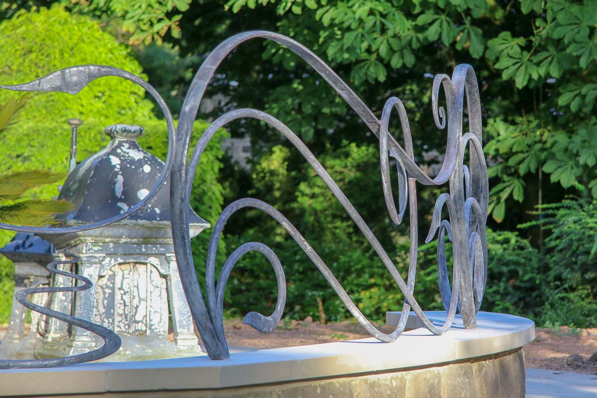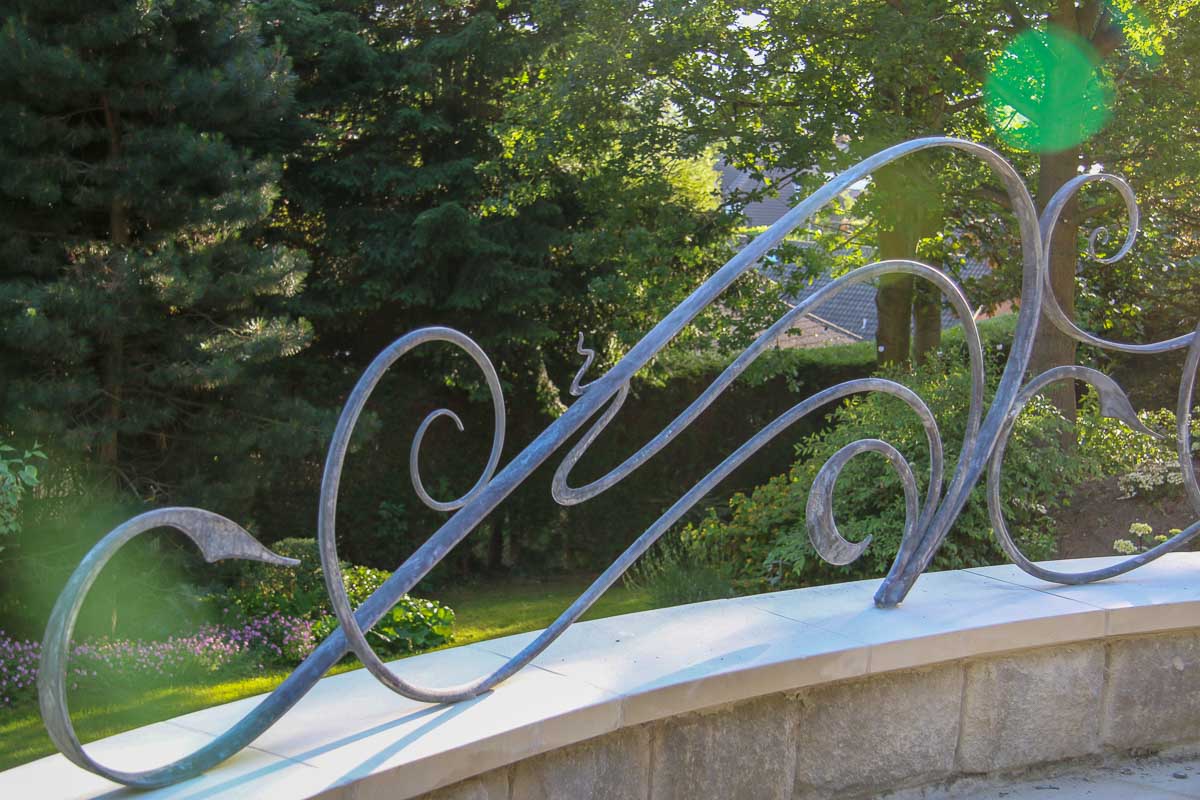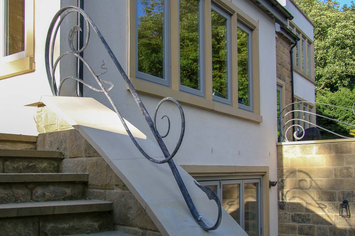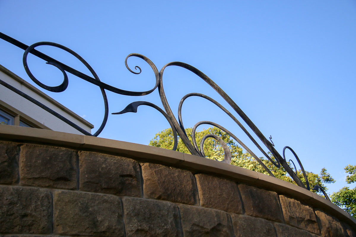 No straight lines were used to create these sweeping and flowing metal railings for a stone terrace. Not only is the design of the railings curved, but the railings follow a curved path around the terrace and down the stairs. The resulting compound curves are time consuming and tricky to form and require constant checking as they are