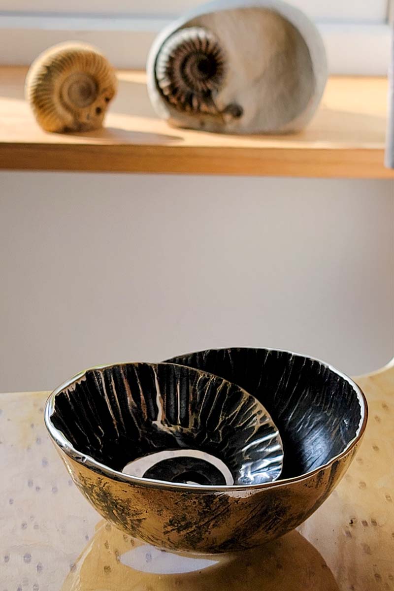 The textured metal is then carefully beaten into a dished spiral suggestive of ammonites found in the rocks.
