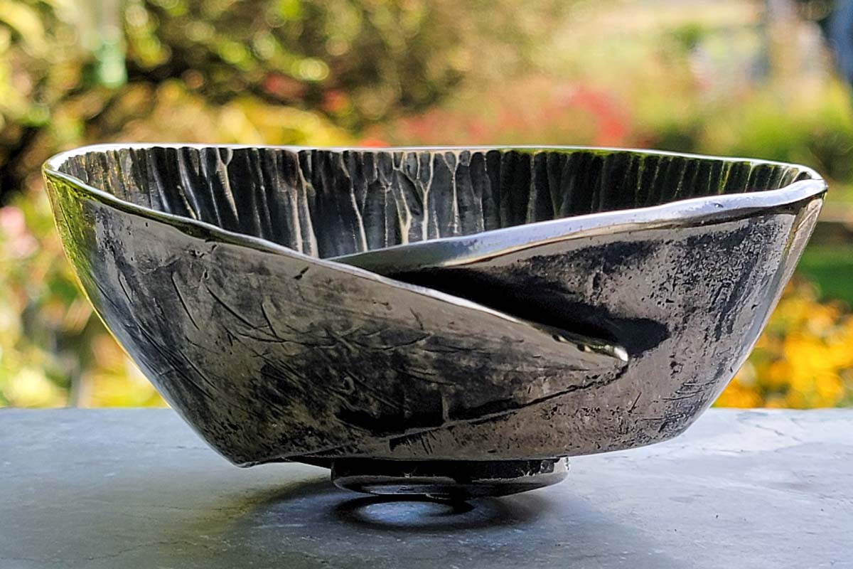 Heat from the forge creates a dark and tenacious firescale on the surface of the metal. This contributes to the bowl's wonderfully rich and worked finish.