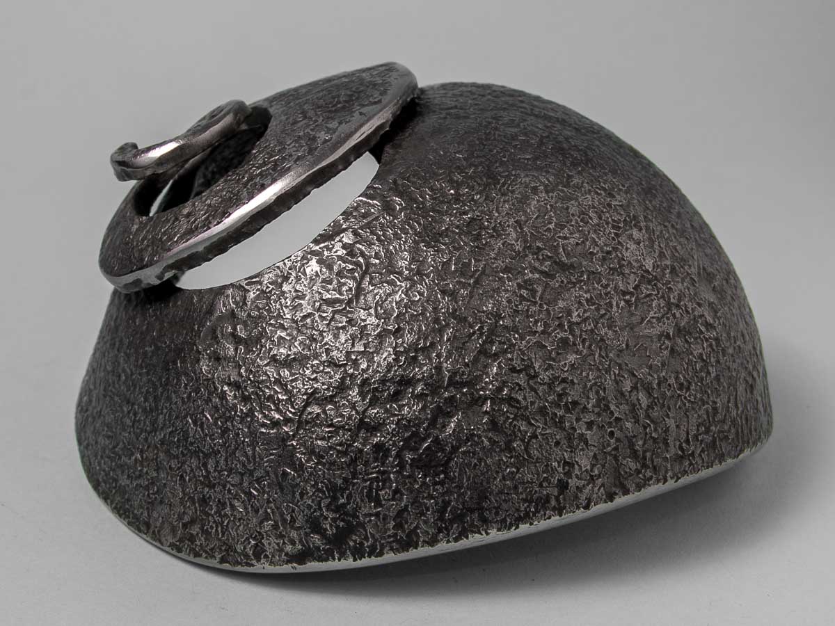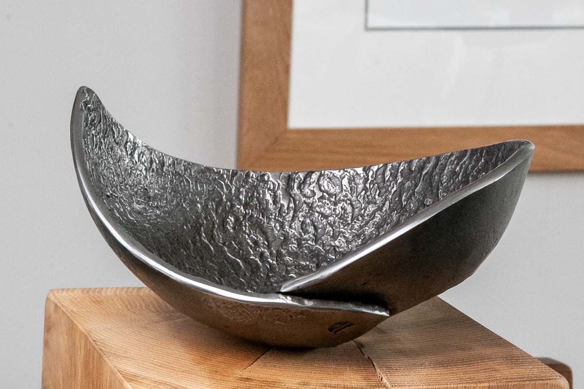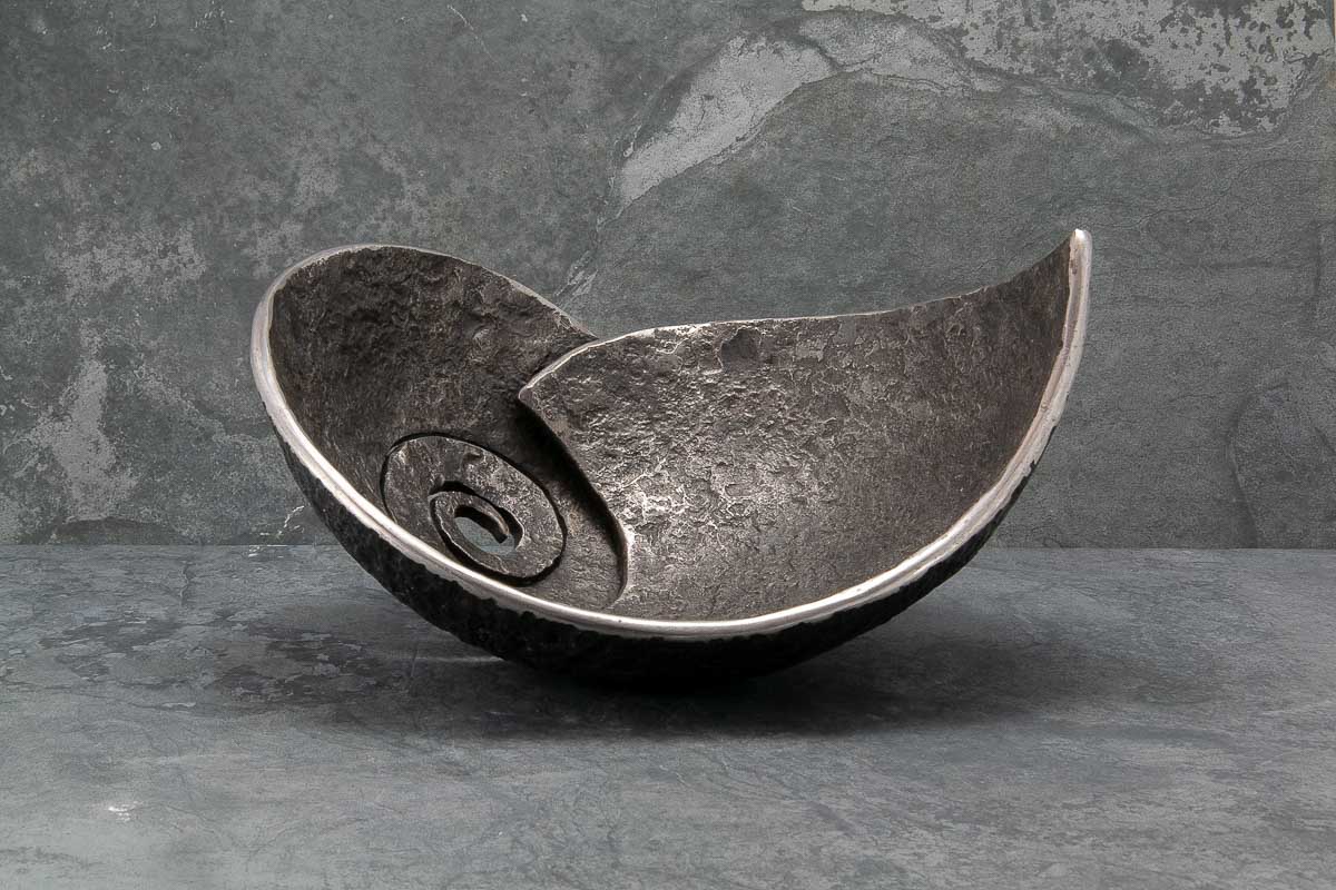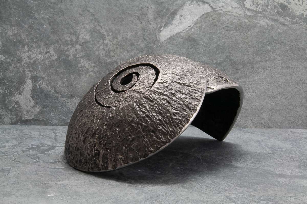 Repeated hammer blows leave unique and expressive witness marks in the metal. This acretion of marks builds up to create a rich and varied rock like texture.