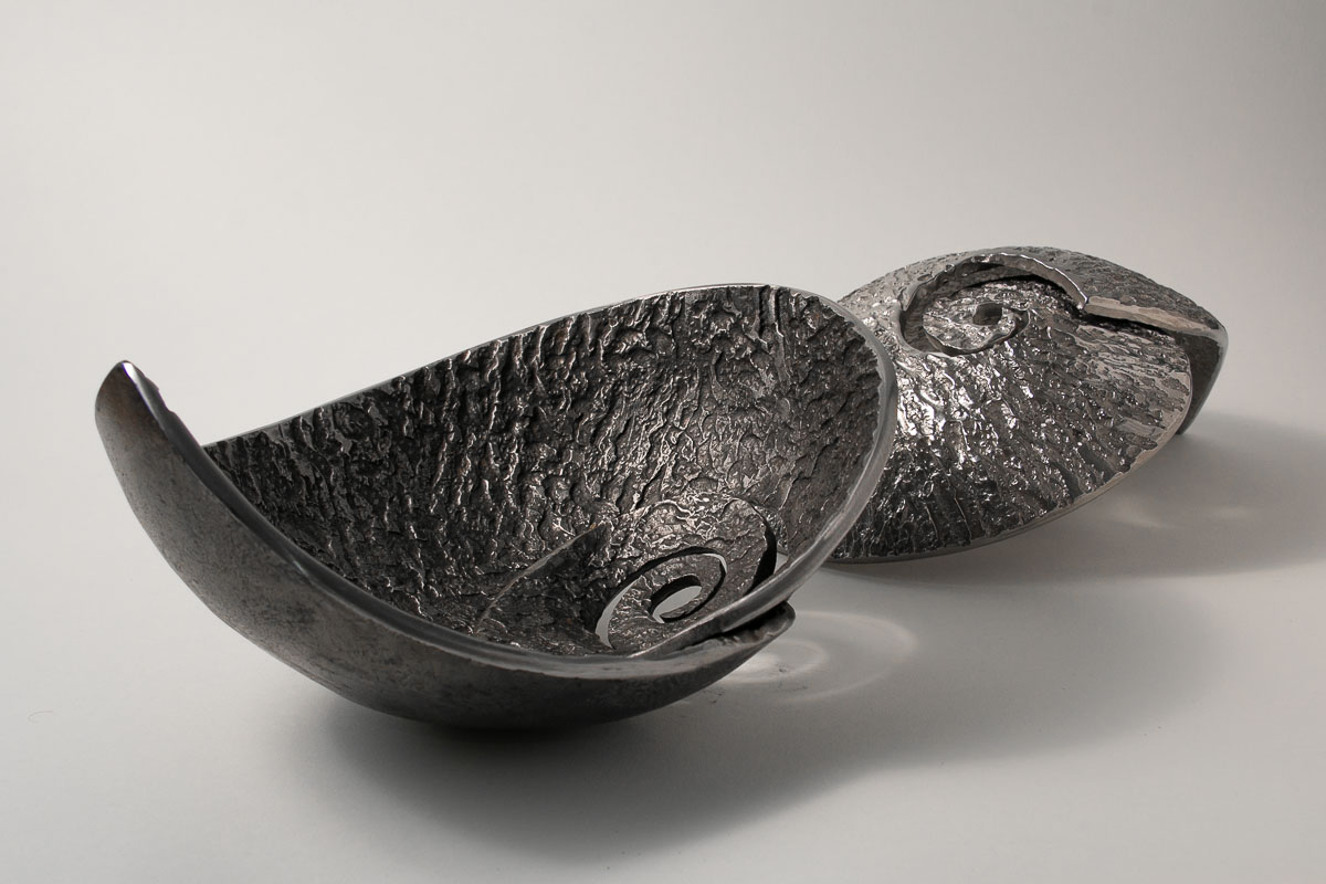 enhance and highlight the metal's complex and natural looking texture. The edges of the bowls are satin