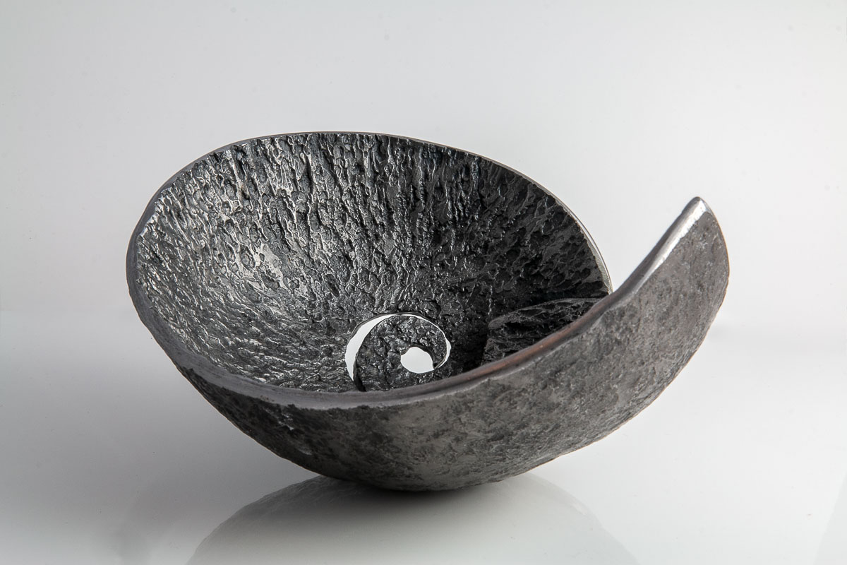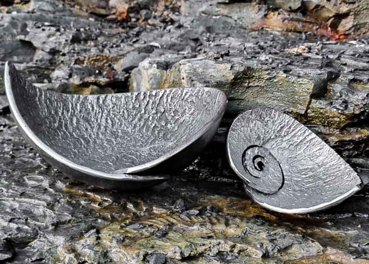 The form of the bowls suggests ammonites, whilst their texture reflects the coast's ancient, layered and sedimentary rocks.