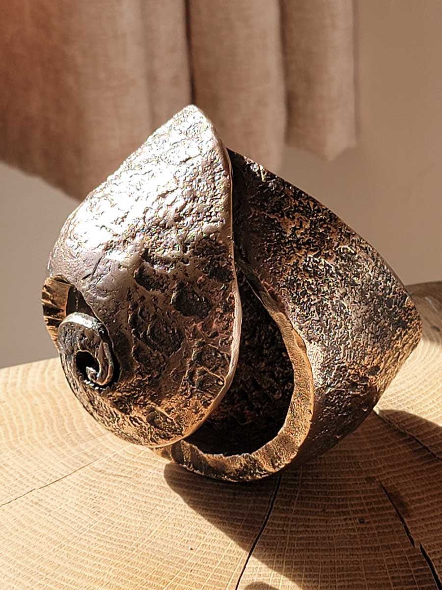 Custom made hammers were used to create the deep rich and varied texture. Once shaped, the bronze was
