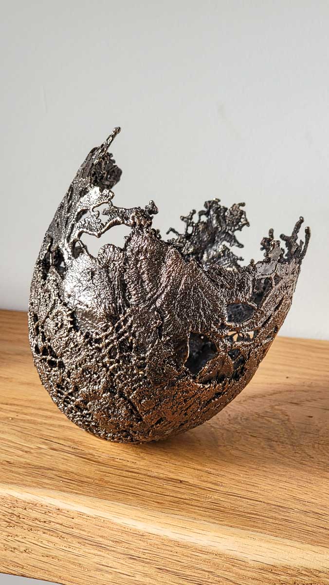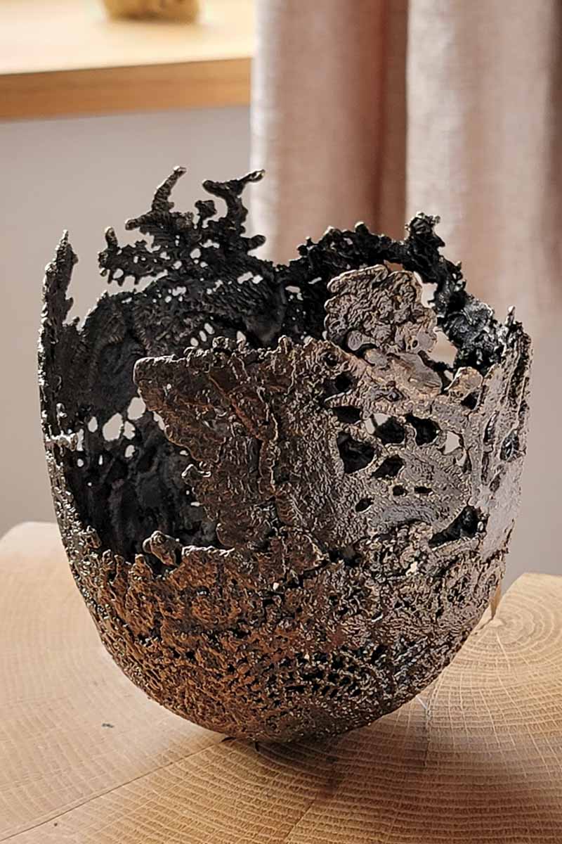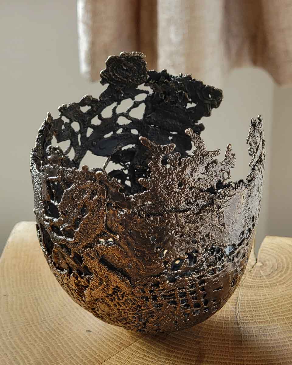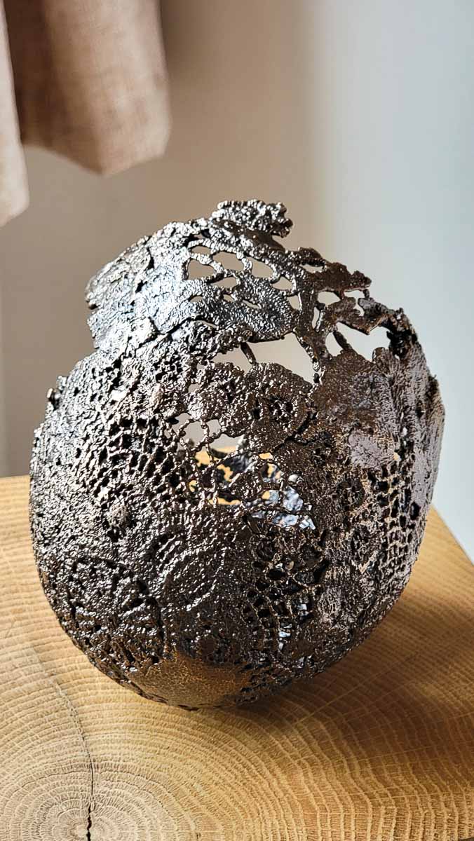 This unique bronze vessel was modelled from small scraps of handmade vintage lace.
