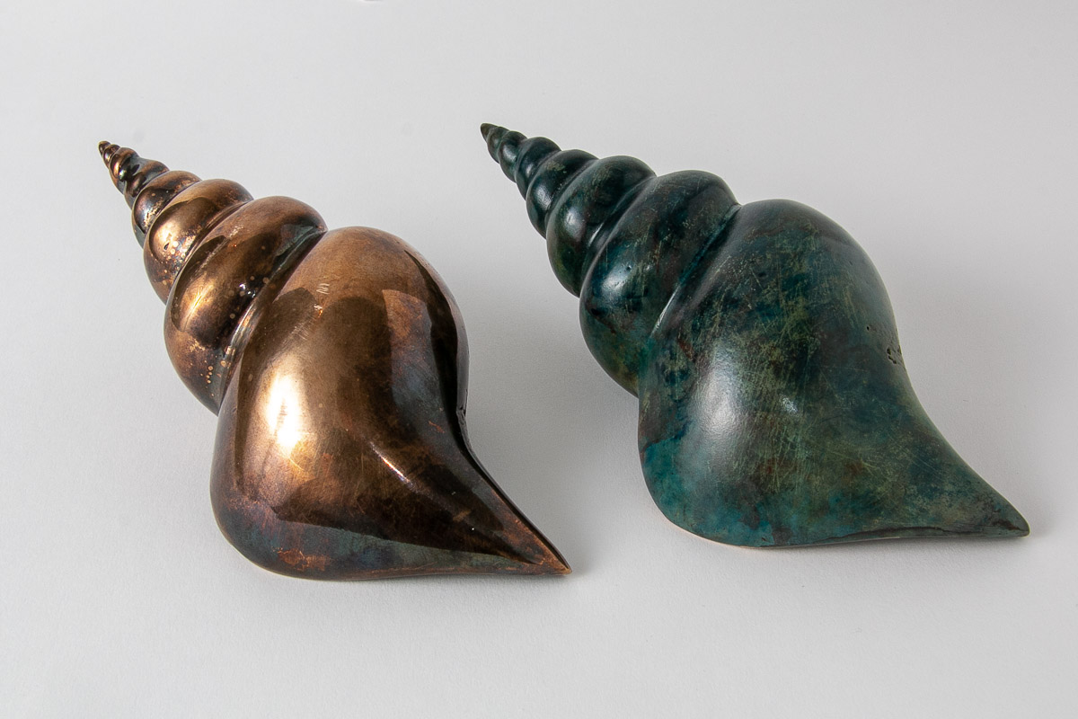 They are a study in the patination of bronze where colours are developed on the metal using heat and a combination of chemicals such as copper