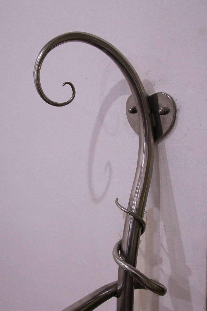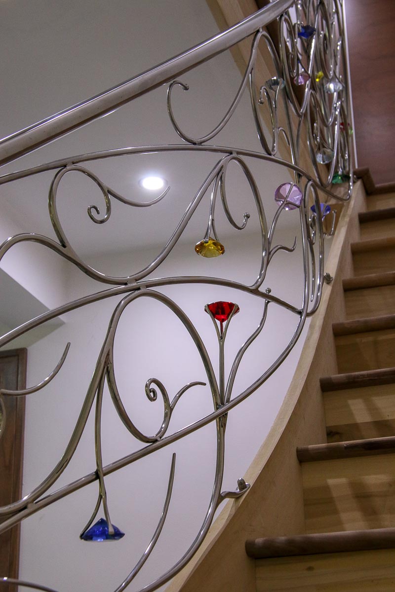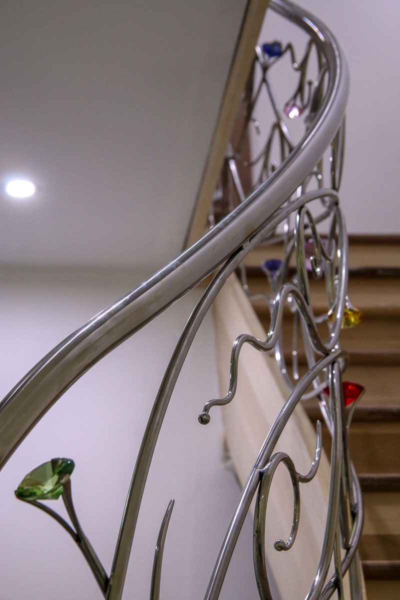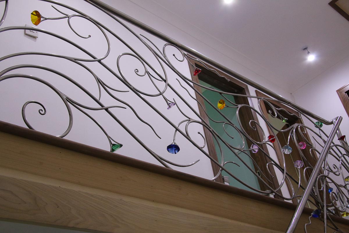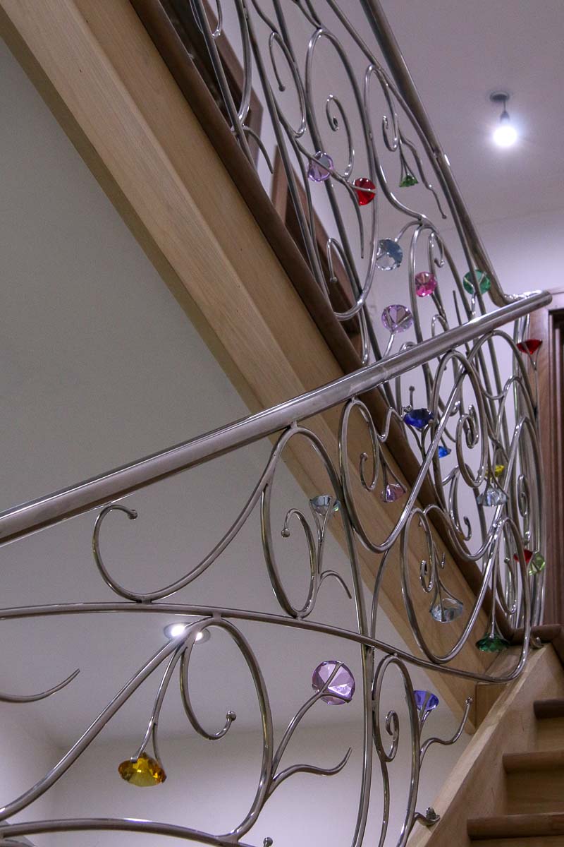 metal handrail has a pleasing tactile quality as it follows the curve of the stairs and twines around the support column to form a feature newel post. This twist is reflected in the gallery newel post as the handrail gracefully