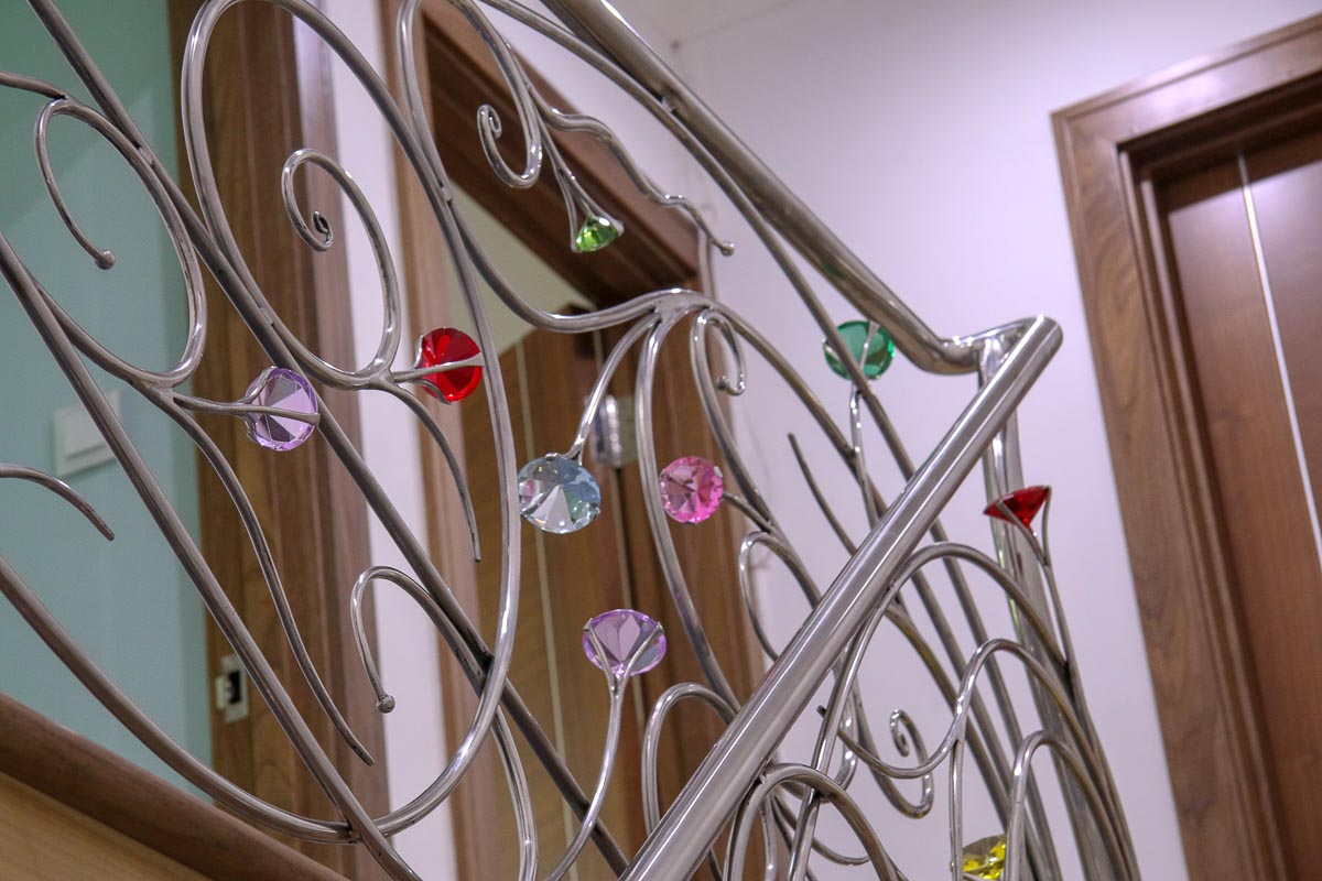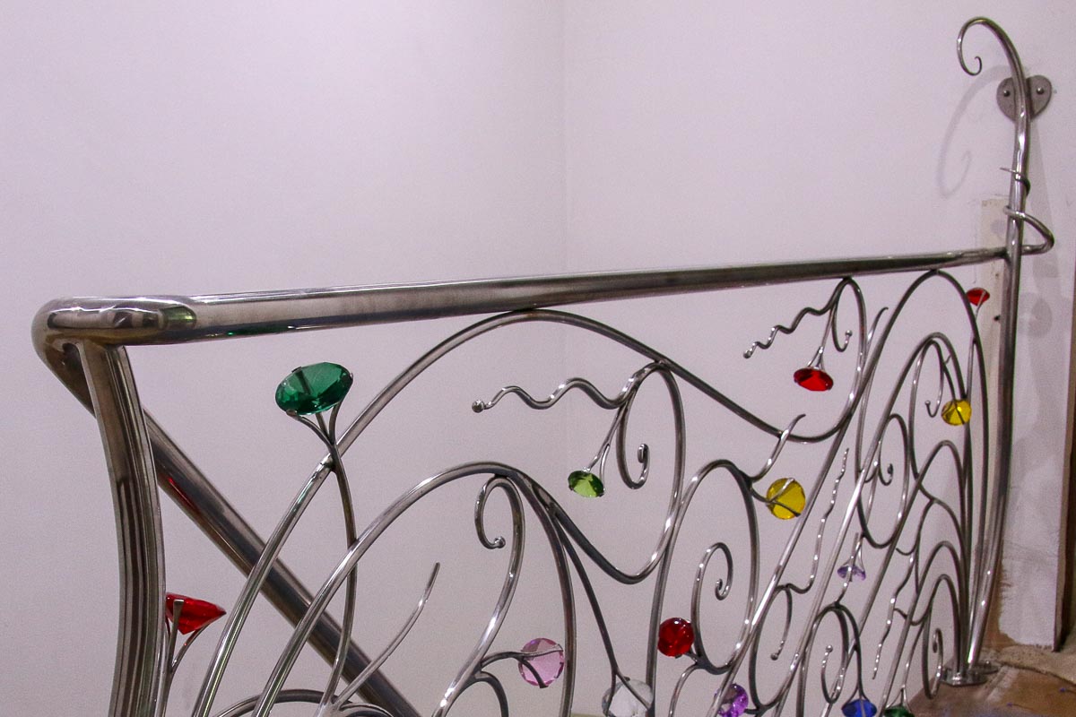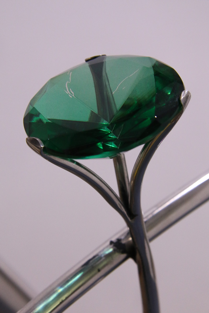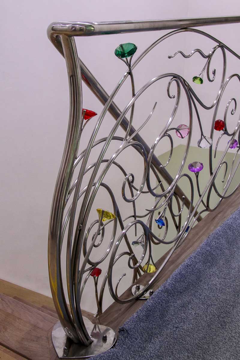 stainless steel and glass "diamond" crystals. Jewellery style fixings hold the crystals in place and enhance their vibrant