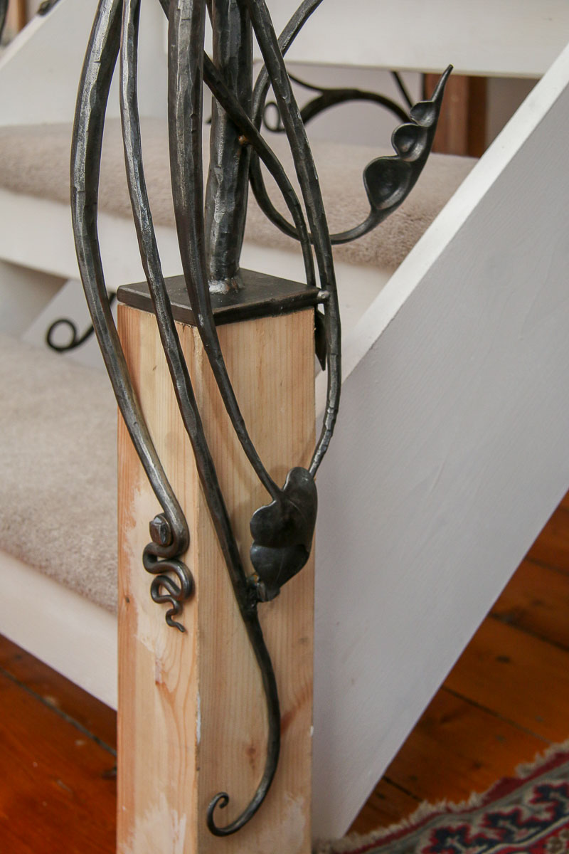 truncated wooden stair post and is entwined by the branches and stems of the rails to form a bold and dramatic feature newel post.